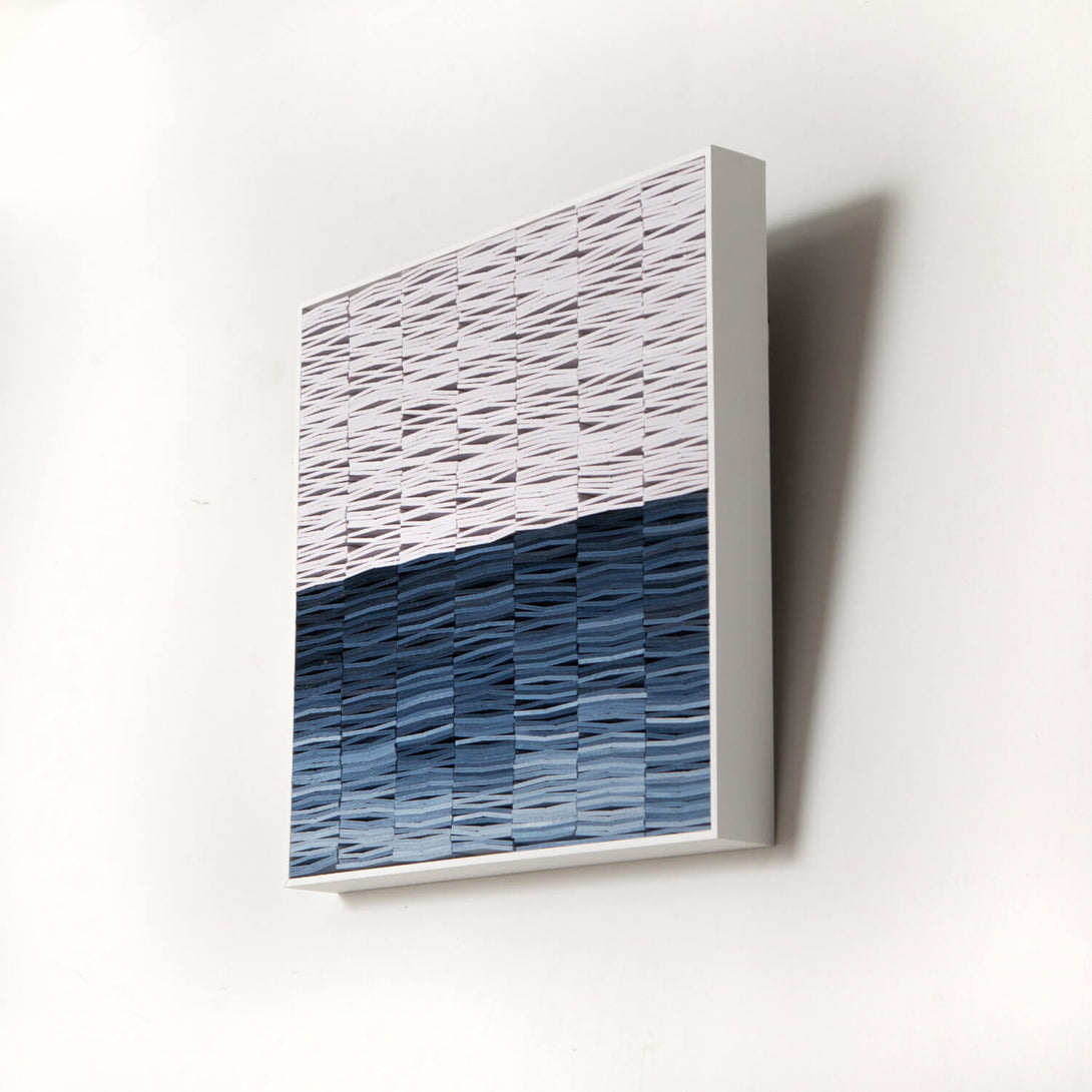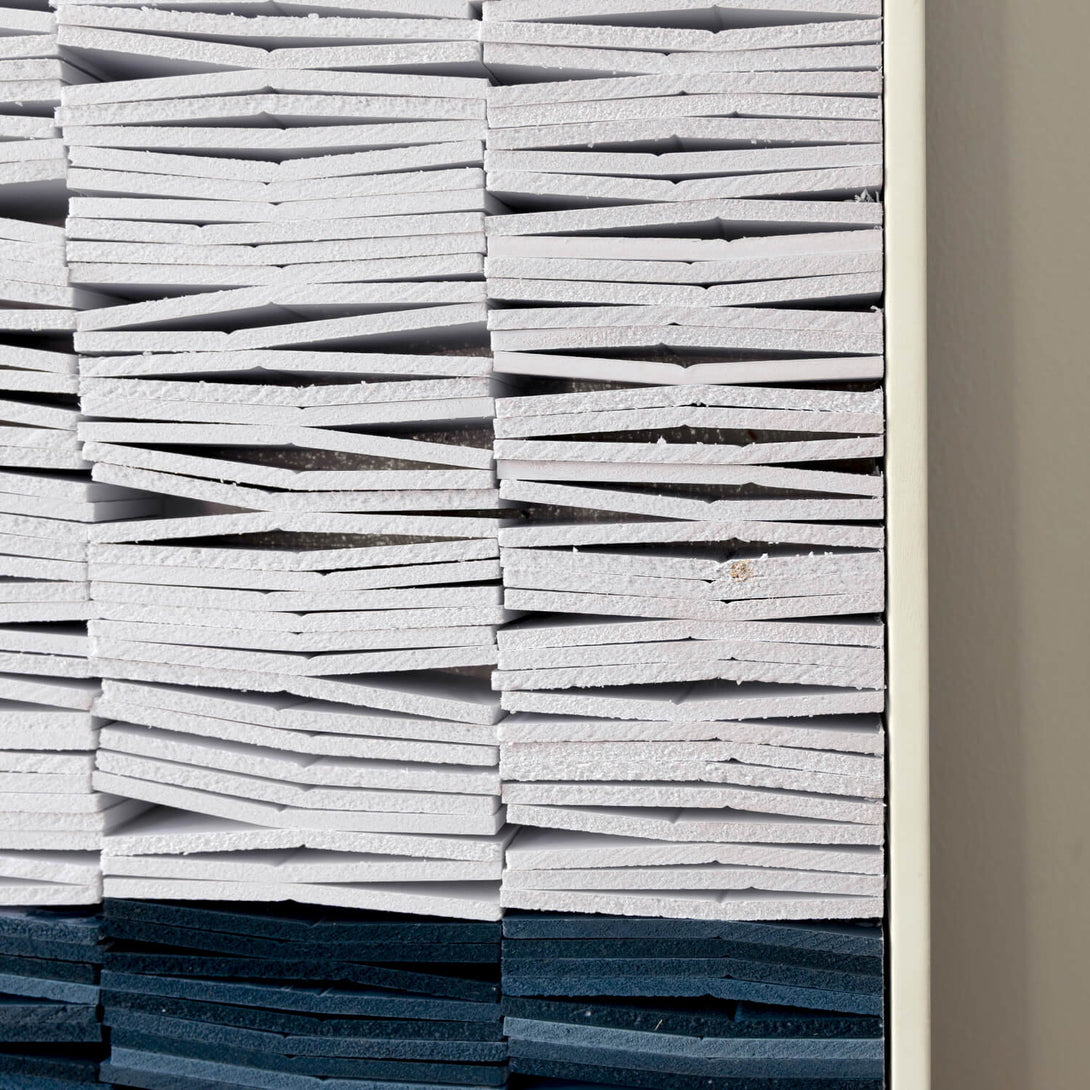 細かく着色具合を変化させつたボードをランダムに配置、かつランダムに折り曲げることで不均一な見え方となり、常に変化する水の流れを表現しています。