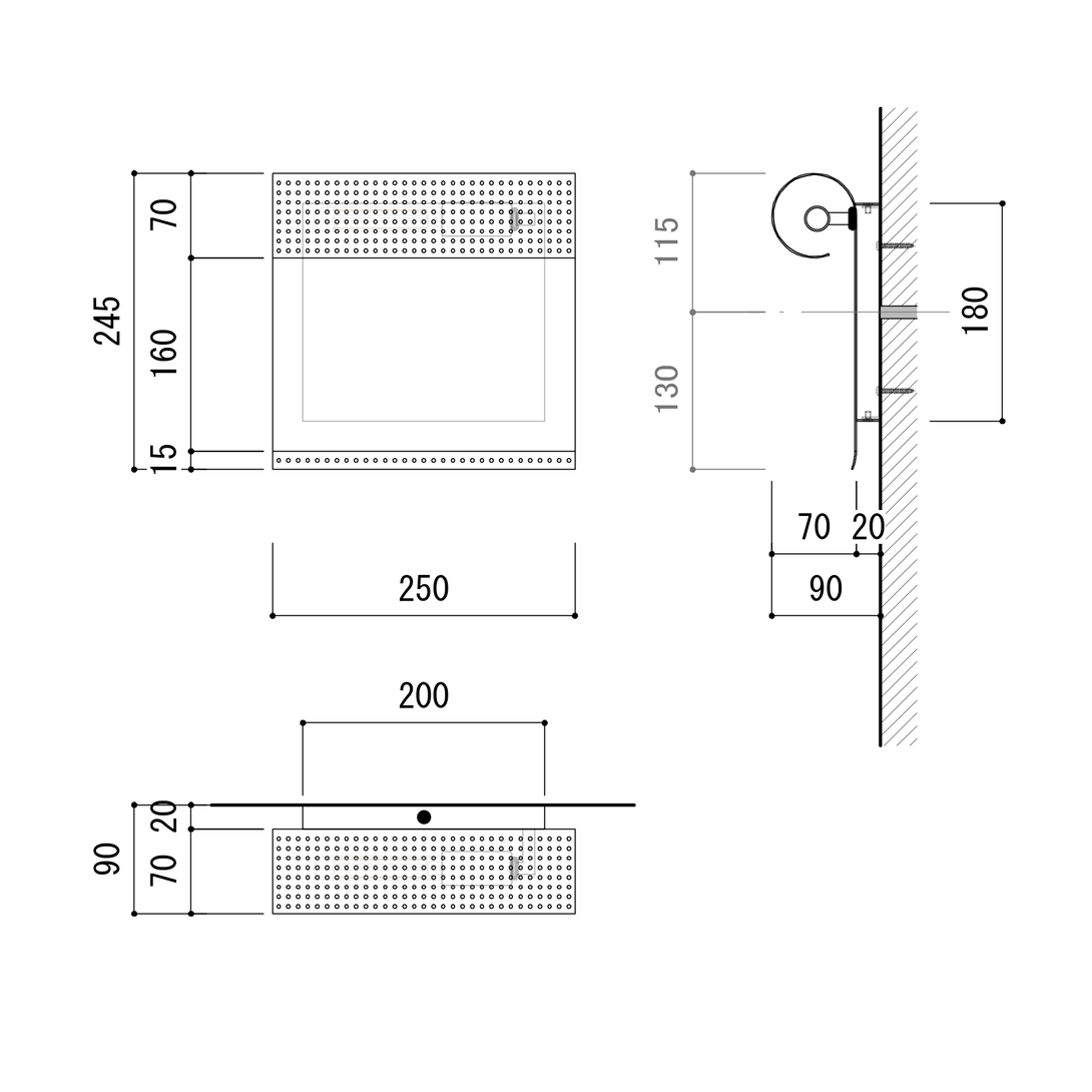 真鍮板材に曲げ加工をした部分の内側に光源を仕込み、パンチング加工という小さな穴開けを施したウォールライト。