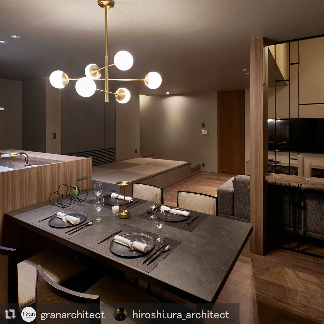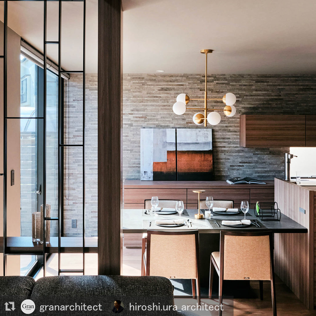 中心軸からシンメトリーに配置されたアームは段によって長さが異なり、水平角度を自由に回転させることができるため、どこから見ても隙のないボリュームがありエレガントさを併せ持った多灯型ライトです。