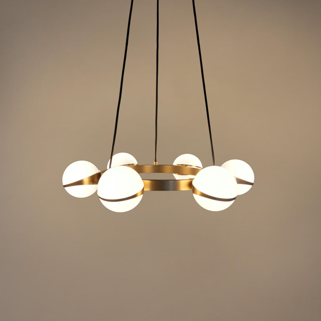 乳白ガラスを支えているような曲線を描いた真鍮フレームが特徴の多灯型照明。