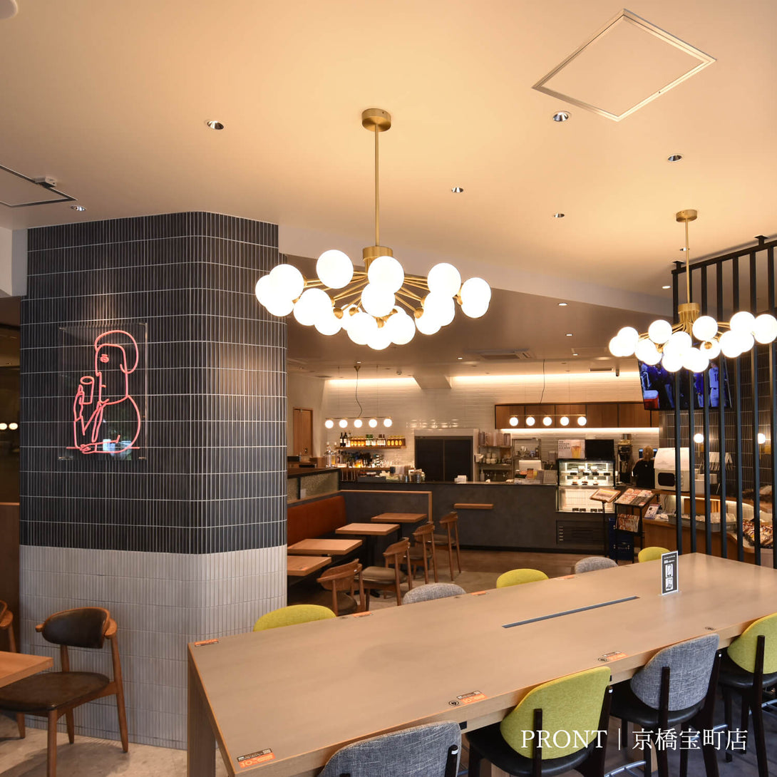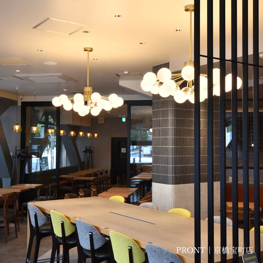 曲げ加工を施した真鍮パイプのアームがそれぞれに角度と高さの異なる2段で構成され、放射状に配置することで全方向に光が放射される柔らかく立体感のあるフォルムを表現しています。真鍮の落ち着いたツヤ感とツヤの無い乳白ガラスの上品さが空間を優しく照らし出してくれます。