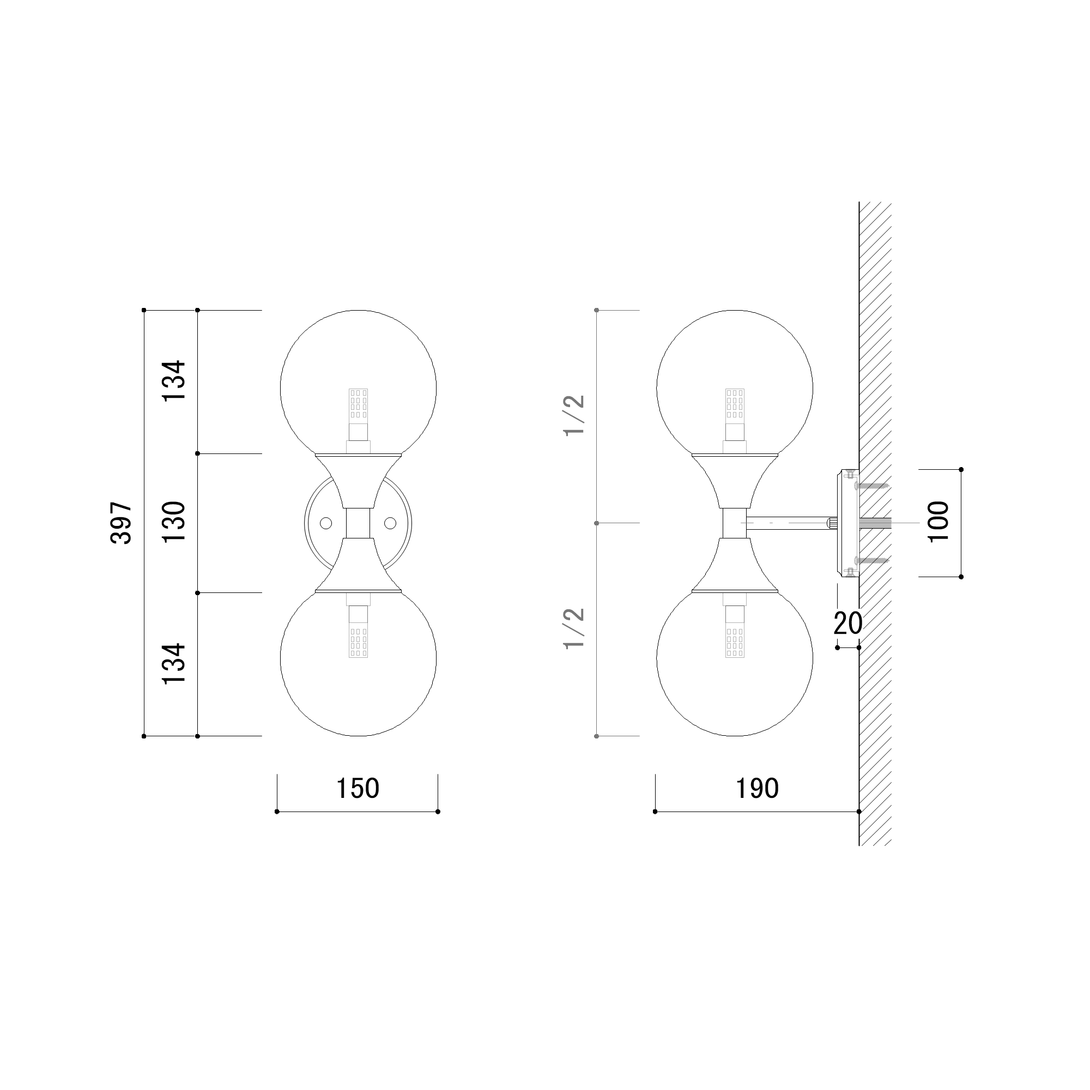 シンメトリーな曲線で構成された真鍮フレームは、上下の乳白シェードに向かって広がっていく美しくクラシックモダンなデザイン。